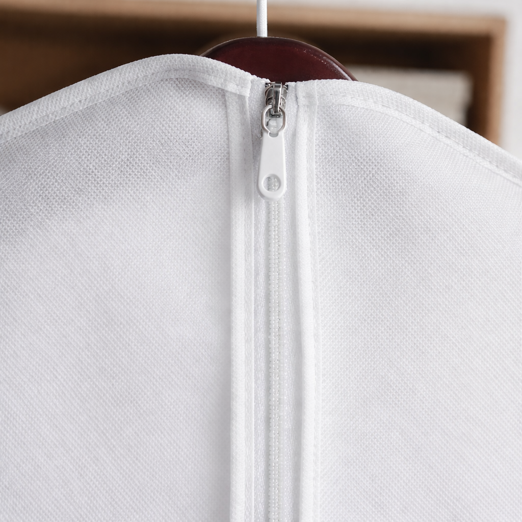 Confeccionada em TNT respirável com acabamento em viés reforçado, essa capa protege suas peças sem abafar o tecido, permitindo ventilação adequada. O visor transparente frontal facilita a visualização, permitindo identificar o vestido sem precisar abrir.