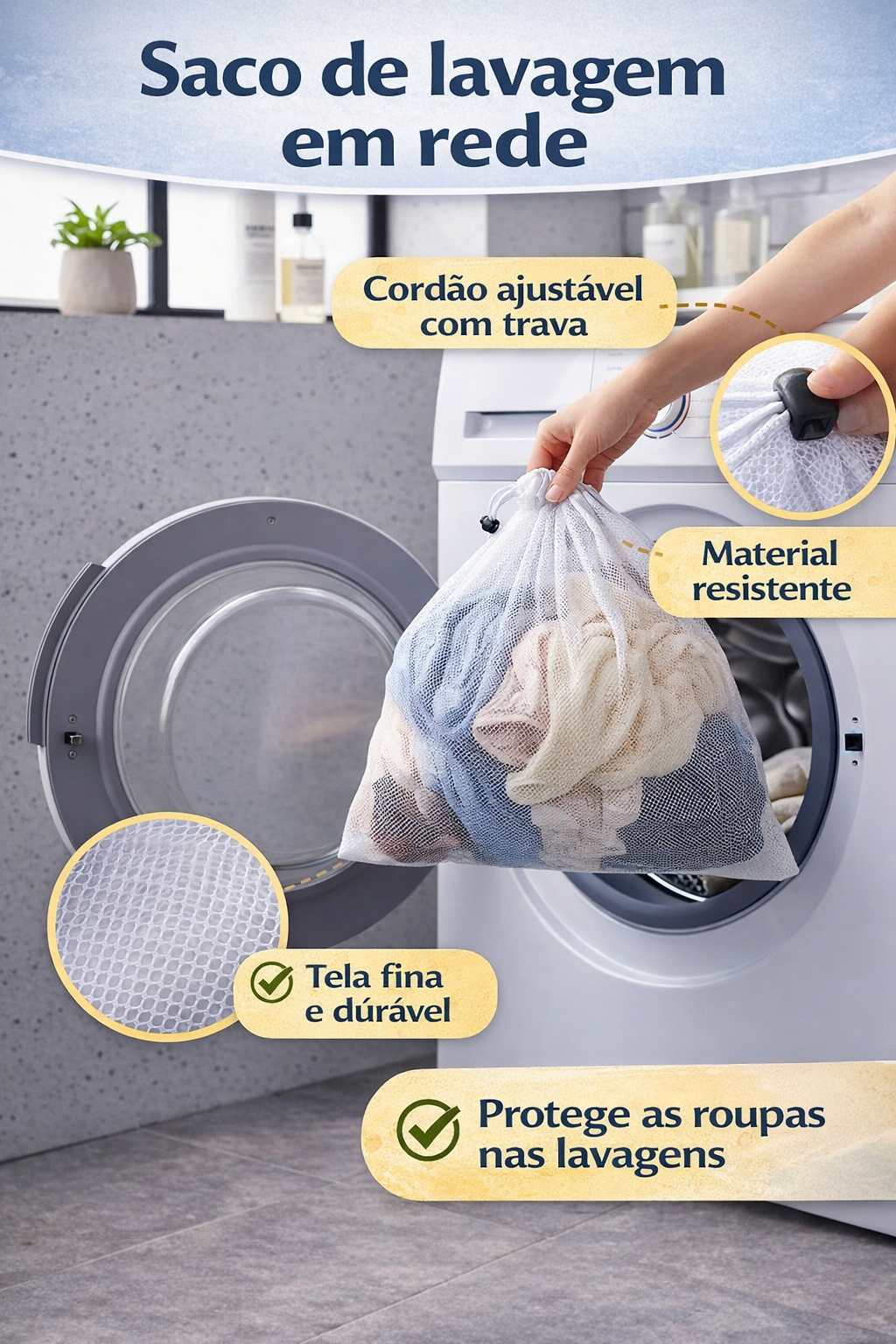 ✔ Mantém roupas organizadas dentro da máquina