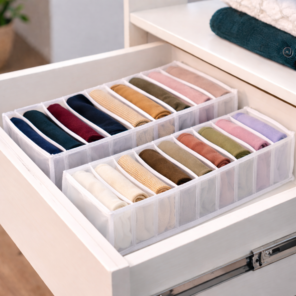 Organize suas gavetas de forma prática e eficiente com a Colmeia Organizadora tamanho G. Perfeita para manter suas roupas sempre visíveis e bem distribuídas.